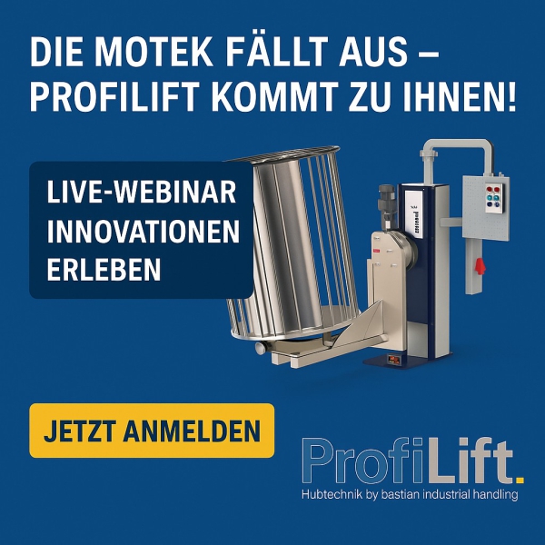Live-Webinar: Innovationen erleben. Effizienz steigern. Prozesse optimieren.Die Motek fällt aus – ProfiLift kommt zu Ihnen!Live-Webinar: Innovationen erleben. Effizienz steigern. Prozesse optimieren.Die Motek fällt aus – ProfiLift kommt zu Ihnen!Die Motek findet in diesem Jahr nicht statt – aber auf Innovationen müssen Sie nicht verzichten! Im ProfiLift Live-Webinar präsentieren wir Ihnen unsere neuesten Hub- und Montagelösungen digital – praxisnah, kompakt und direkt aus der Produktion. Erfahren Sie, wie die ProfiLift- Hubtechnik Ihre Prozesse effizienter, sicherer und ergonomischer gestaltet – mit Beispielen aus der industriellen Anwendung. Termin: 07.November 2025 Dauer: ca. 45 Minuten Ort: Online (Sie erhalten einen Zugangslink) mailto:event@ProfiLift.de Bitte geben Sie Ihren Namen, Ihr Unternehmen und Ihre Emailadresse an. Das Webinar richtet sich an Produktionsleiter, Instandhalter, Werksplaner und Entscheider, die ihre Prozesse mit intelligenter Hubtechnik optimieren möchten. ProfiLift – Hubtechnik by bastian industrial handling GmbH Innovationen aus Deutschland. Für effiziente und sichere Arbeitsprozesse weltweit. |