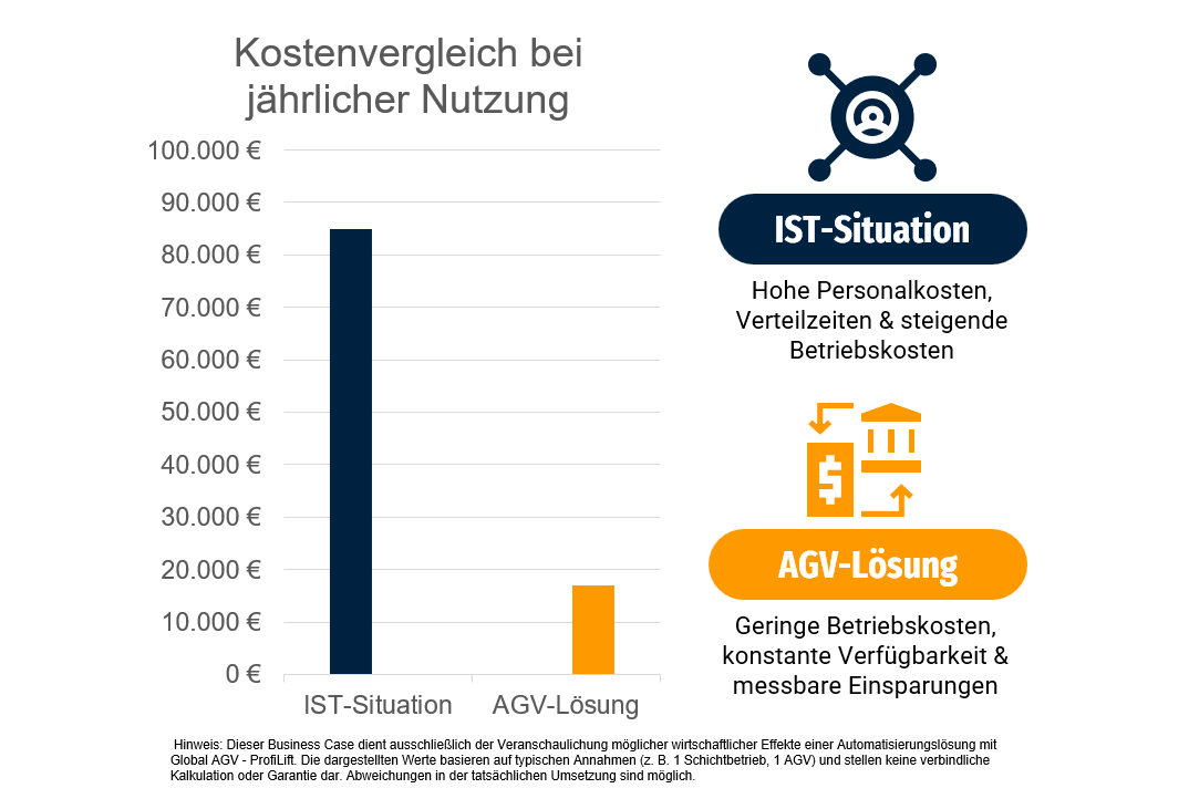 Sie möchten wissen, wie sich der Global AGV in Ihrer Produktion konkret rechnet? Kein Problem: Auf Basis weniger Kennzahlen (z.B. aktueller Personaleinsatz, Palettenanzahl, Schichtzeiten) erstellen wir für Sie gerne eine individuelle Wirtschaftlichkeitsberechnung.