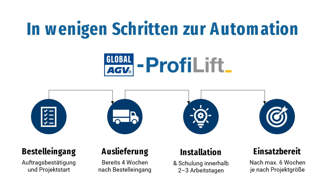 Der Global AGV by ProfiLift wurde für eine möglichst einfache Implementierung entwickelt. Nach kurzer Vor-Ort-Analyse, Einrichtung der Fahrstrecken und Schulung kann das System innerhalb von 2–3 Tagen produktiv eingesetzt werden – ganz ohne komplexe Softwareinstallationen.